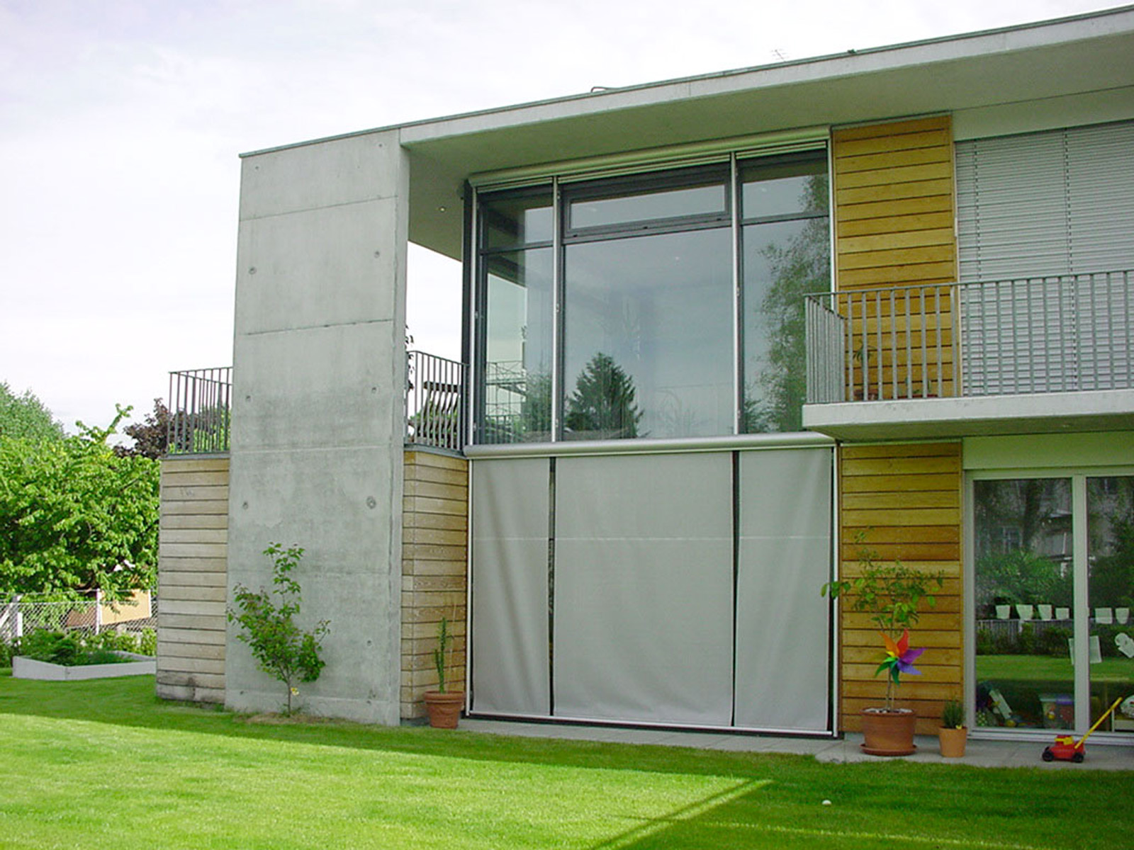Das Haus ist als Massivbau konzipiert, die Fassaden des Hauptbaukörpers sind in Sichtbeton aufgeführt, die angedockten Boxen sind mit Akazienholz verkleidet.