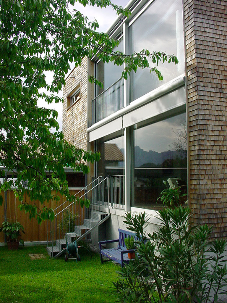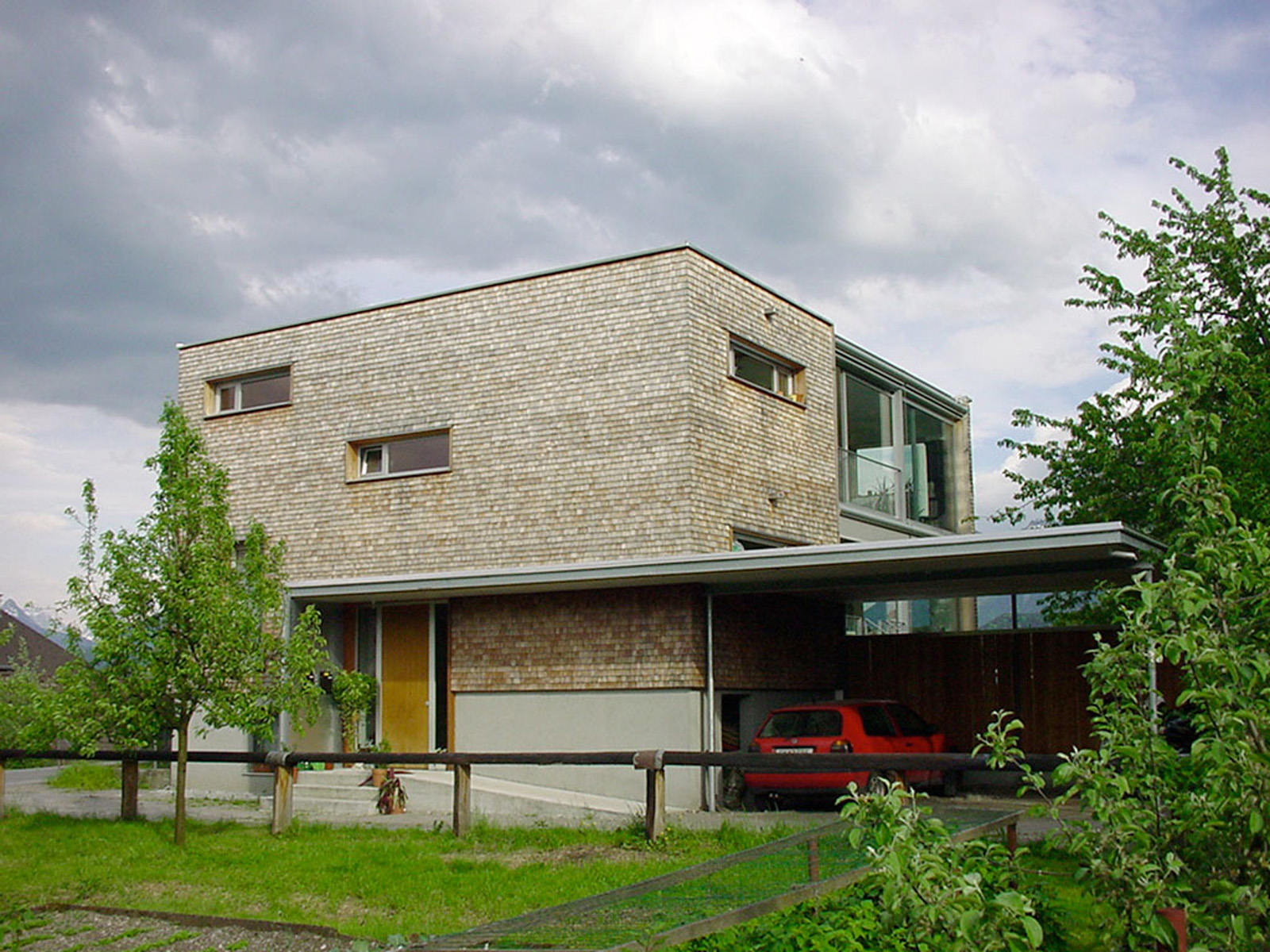 Aufbauend auf einem bestehenden Kellergeschoß (die beiden Obergeschosse waren in ihrer Substanz schlecht und nicht zu retten) wurde ein Wohnaus mit 2 Wohneinheiten errichtet. Das Gebäude mit zwei übereinander liegenden identischen Wohnungen zeichnet sich durch große Kompaktheit und eine extrem sparsame Konstruktion aus. Da laut Baugesetz ein Neubau an der gleichen Stelle nicht zulässig gewesen wäre, wurde das Gebäude als Umbau geplant, die „Struktur“ der tragenden Wände des alten Hauses findet sich somit im Neubau wieder, alle Wände wurden jedoch ersetzt und auch die Organisation der Grundrisse hat mit dem ursprünglichen Bestand nichts mehr gemein.
